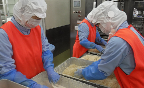 給食センターでは、児玉郡市産のお米を使用してご飯を炊いています。米飯室では、朝6時から作業が始まります。